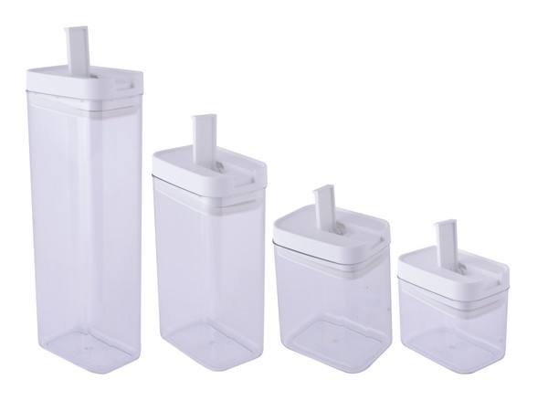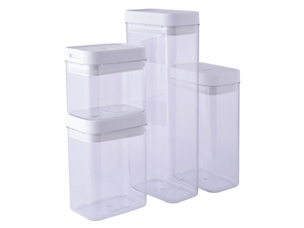 Airtight Storage Containers in a set of 4. Clear containers with white lids that have airtight seals at the bottom of the lids. Lift the lever on the lid to open the seal, and drop the lever to tightly close the containers. Ideal for your cereals, pasta, cookies, nuts, snacks, coffee beans or any other product you wish to keep fresh. Say goodbye to staleness. STORAGE YOU CAN TRUST