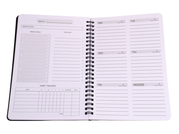 Stay organised with this elegant Weekly Planner. The non-dated weekly layout allows you to start planning at any time of the year without wasting pages. The 52 inner pages include space to add notes on days from Monday to the Weekend, weekly goals, to do list, and habit tracker. Comes with a black spiral binding and inner 100g/gsm paper.