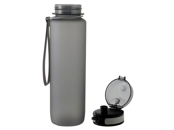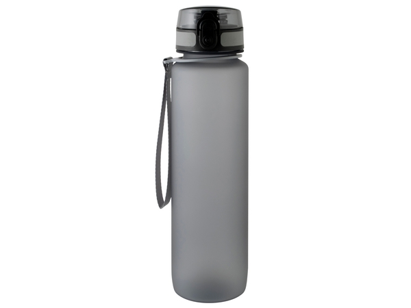Capacity: 1 Litre. The bottle has a wide mouth with an inner strainer.The lid has a clip that when lifted up it secures the lid from easily opening and a press button to auto open when the clip is turned down. With a fast flow narrow drinking spout. Comes with a satin carry strap.