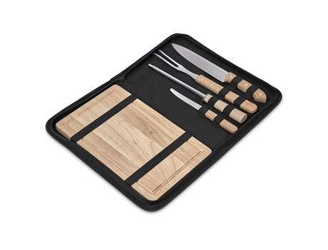 Whether it’s at that self-catering place with the small wine glasses and the blunt knives, or just out at the braai at home, this food prep set is bound to be your new best friend. It features a chef’s knife, a chef’s fork, a knife sharpener and a serrated steak knife on one side, and a wooden cutting board on the other. All are packaged within a rigid bag with a carry handle, and a recess badge for dome branding.