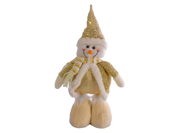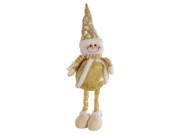 This festive decoration combines charm with sturdiness. Dressed in a sparkling gold outfit and featuring a cheerful face, this snowman is the perfect addition to your holiday decor. One of its standout features is its Pinocchio-style legs. When fully extended, the snowman reaches an impressive height of 65cm, adding a whimsical touch to your festive setup. When condensed, it stands at 47cm, allowing you to adjust the height based on your display needs. The flexible design means you can easily position it on a mantel, under the tree, or by the entrance to welcome guests.