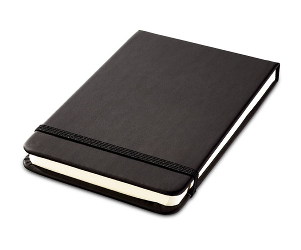 A pocket-sized, flip cover notebook with an elastic closure.