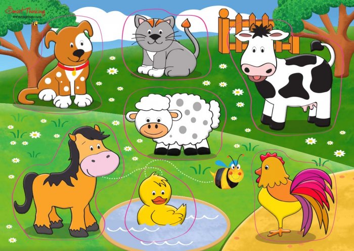 A beautifully illustrated wooden tray puzzle containing 7 pegged pieces.