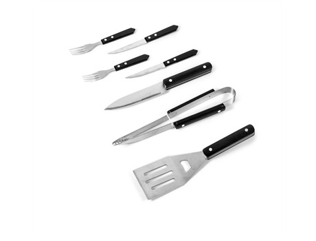 Elegant 2 person set that makes a great outdoor gift in a stylish grey. Features: 18/0 stainless steel & black wood BBQ tools / 2 x steak knives & forks . Recessed plaque for domed sticker application attached to case. Polycanvas zippered case: 37.5 ( l ) x 18.6 ( w ) x 4.5 ( h ).