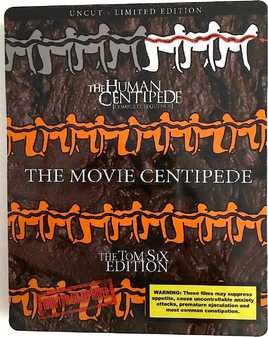 LIMITED EDITION! The Human Centipede – The Movie Centipede Steelbook – Blu-ray The original UNCUT Tom Six Edition! Disc 1: The Movie Centipede (part 1, part 2 and part 3 connected) Disc 2: The making of part 1, The making of part 2 (new), The making of part 3, The Human Centipede 2 in FULL COLOUR, Tom Six home video: Decaying in Style, Deleted Scenes and Paintfarts clip