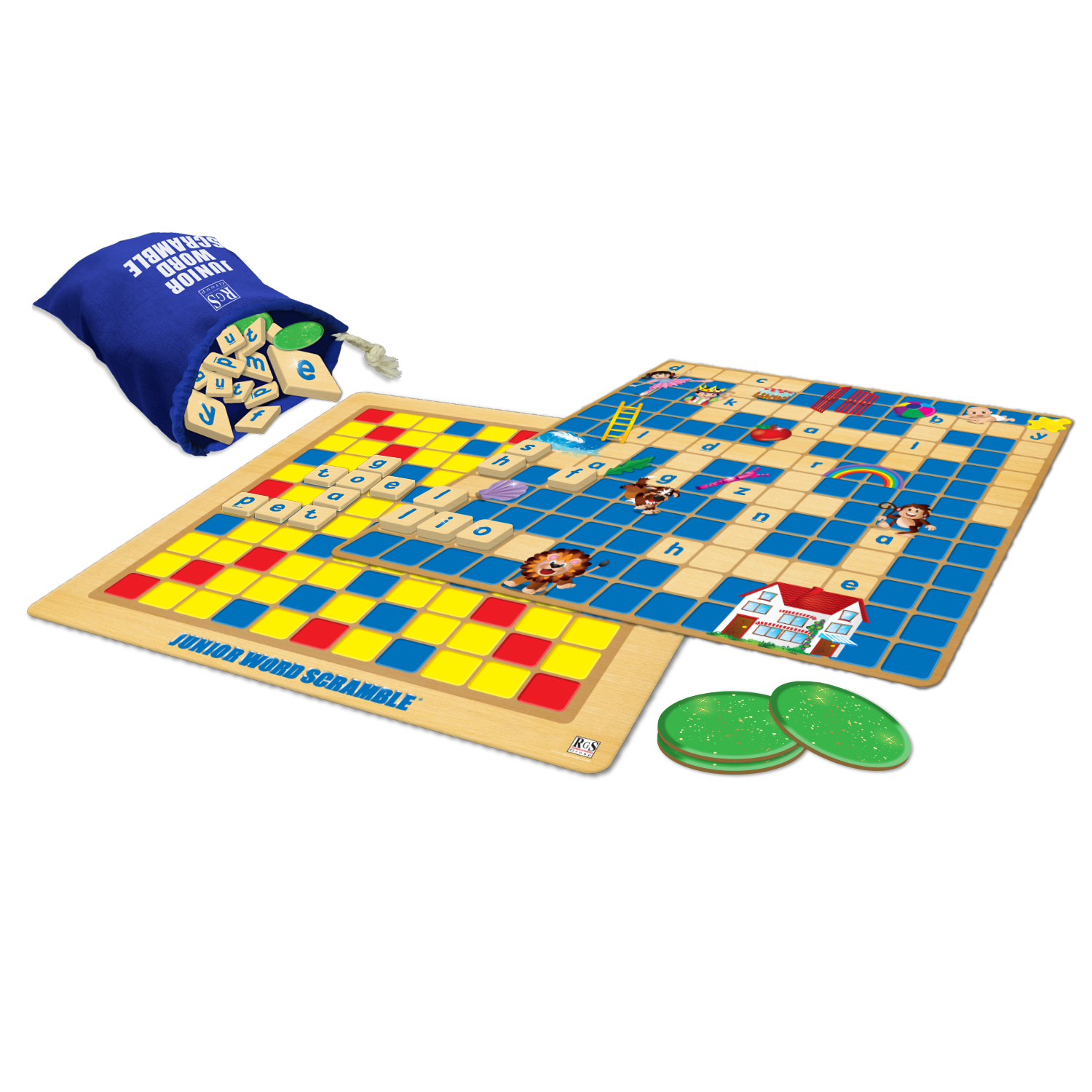 The second side of the board, designed for older children (8+), consists of a 13×13 grid on which players must create words, using the letter tiles provided. The first word must be placed across or down the grid with one letter covering the central star.