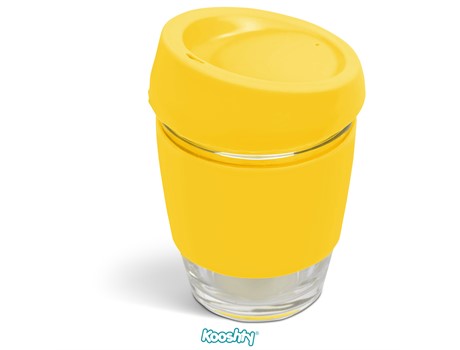 The Kooshty Kup Original, with its colourful silicone lid and grip band, is a fun and practical glass cup for the home or the office, and is ideal for coffee on the go, fitting comfortably inside your vehicle’s cup holder.