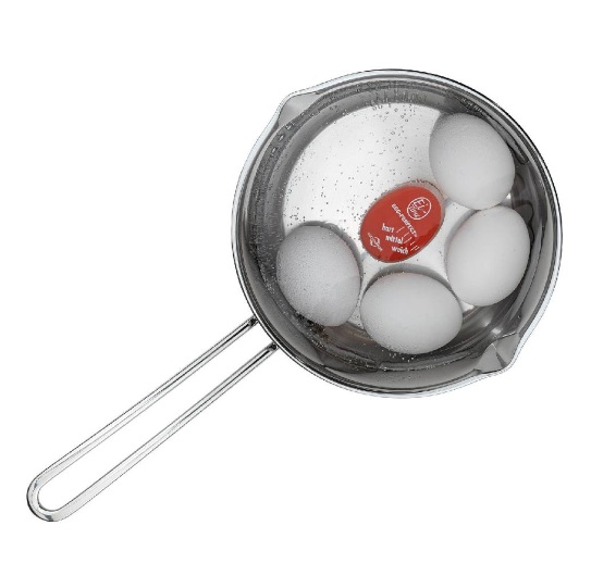 The EI-TIME model from Kuechenprofi is equipped with a sensor and a colour-changing element. The sensor measures the temperature, the colour-changing element takes on the heat just like your breakfast egg. During cooking, the timer changes colour from the outside to the inside through bright red to dark chestnut. On the scale, you can read the degree of hardness and match the perfect moment to get the egg out of the pot. The result is eggs that are cooked at the desired consistency and to everyone’s wishes.