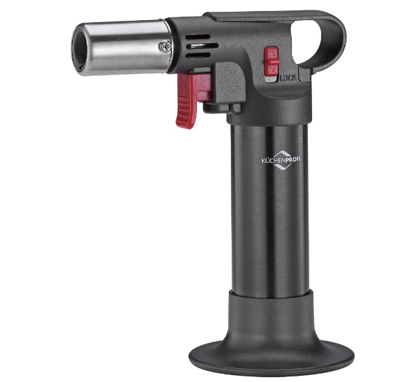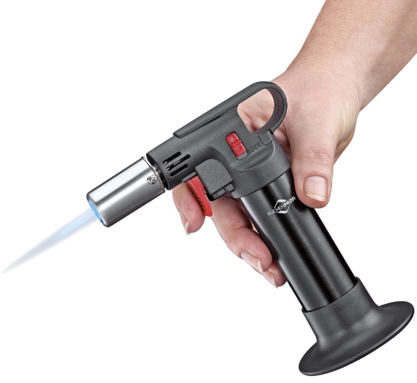 Black, plastic, gas torch for caramelising Crème Brulé and browning potato bakes. Comes with a safety lock and only requires one hand to use.