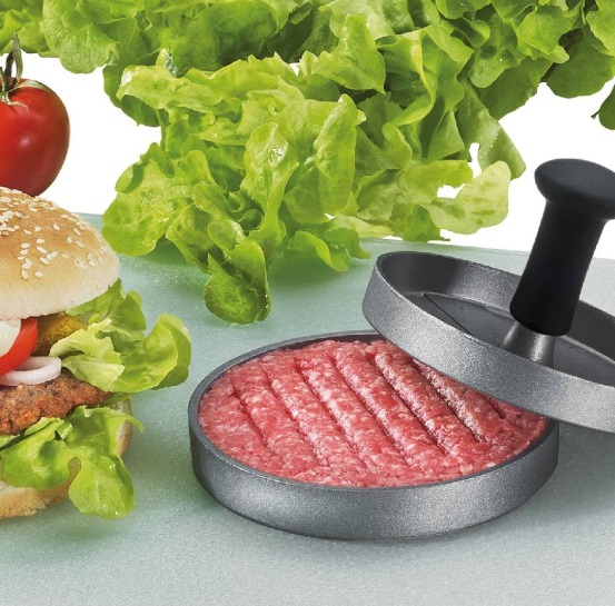 12 cm non-stick Aluminium Hamburger Press with plastic handle.