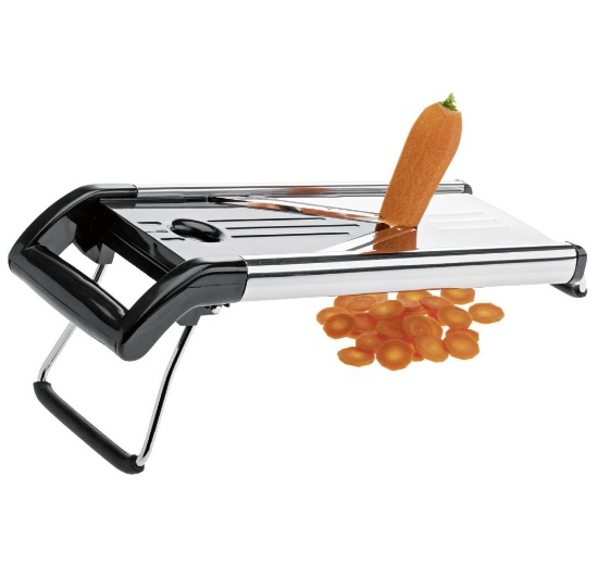 Stainless Steel Mandolin Slicer with non-slip stand and 5 cutting inserts, from 1.5mm to 7.5mm. The v-blade ensures consistent results.
