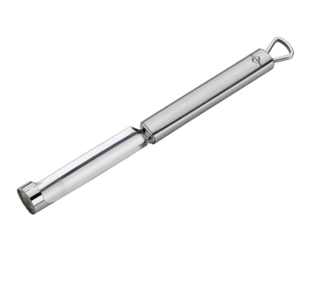The sharp blade slices quickly through the core of apples and pears and reduces the amount of edible fruit that goes to waste. The triangular-shaped handle ensures a steady, comfortable grip and the eyelet at the top lets it be hung with the other utensils.