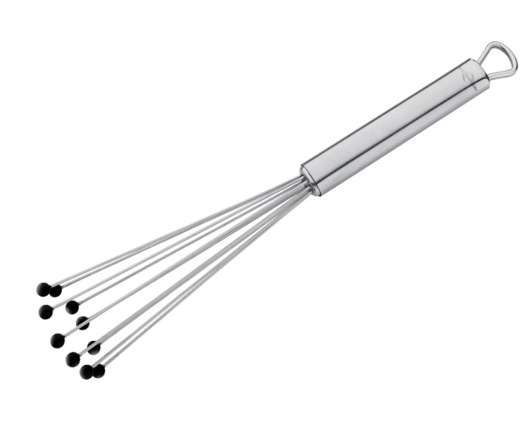 Flexible wires with balls for efficient and easy stirring Thanks to the wires of different lengths, the outer edge in pots / bowls can be reached Due to the vibrations, the balls generate a high whisk performance Ideal for cooking in coated pans and pots Heat-resistant up to 280 �C Length: 28.5 cm Width: 5.1 cm Height: 5.1 cm Stainless steel / silicone