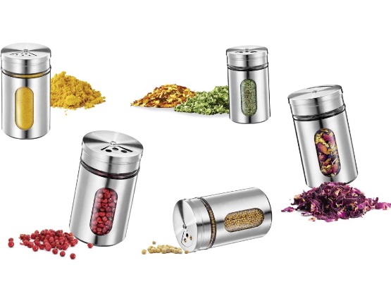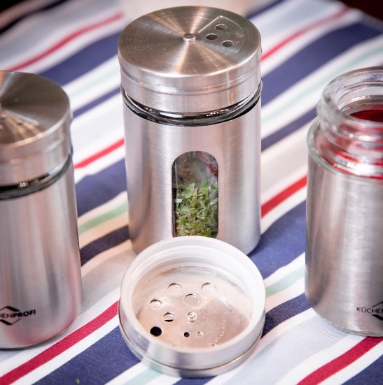 Herbs and spices add that special touch to any meal. A rotating cover allows the option of 3 different size holes – fine, medium, coarse, and closed. The tight-fitting lid prevents contents from spilling and when closed, keeps the contents fresh. The glass viewing window is useful to see which herbs or spices are in the dredger and how much is still available. The stainless steel does not transfer odours so it can be used for different spices. It looks good in the kitchen and on the table.
