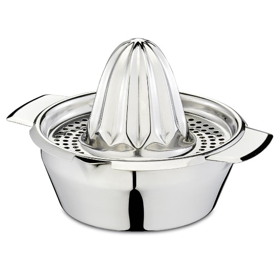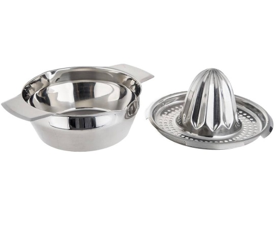 Stainless Steel Citrus Press with a bowl for easy squeezing and drip-free pouring of the juices from oranges, lemons, and limes. Also, dishwasher safe.