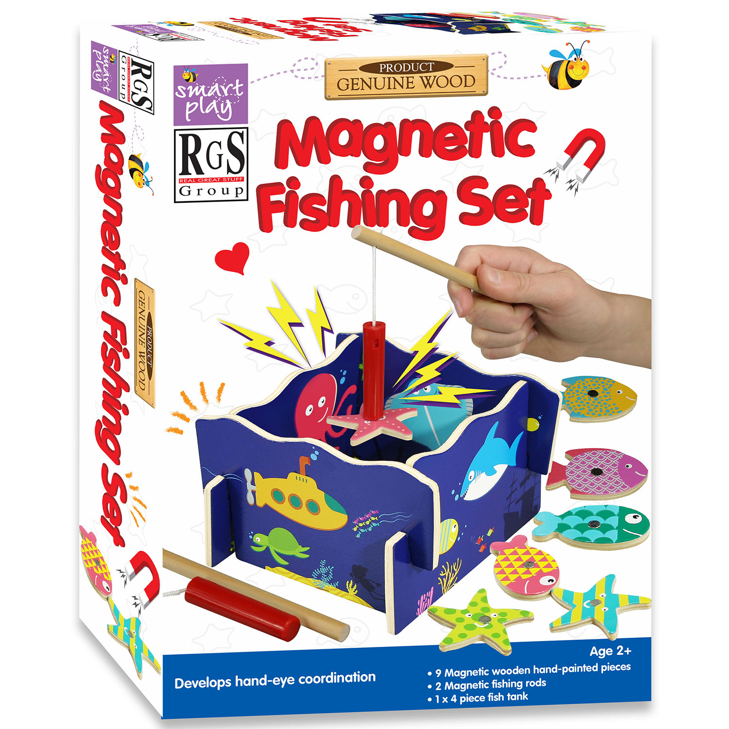 Set contains 9 magnetic wooden hand-painted pieces, 2 magnetic fishing rods and 1 4-piece fish tank.
