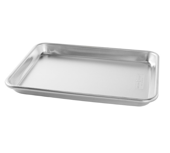 Natural aluminum Baker’s Quarter Sheet is perfect for small batch jobs in the kitchen.