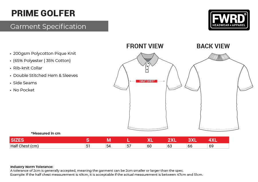 The Prime Golfer is a premium short-sleeve polo shirt crafted from a durable 65/35 polycotton blend in a 200gsm CLASSIC PIQUE knit.
