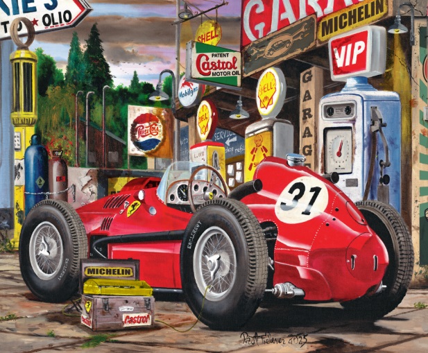 A true classic Ferrari racer parked outside a repair garage. Painted by local artist Paul Treleven.