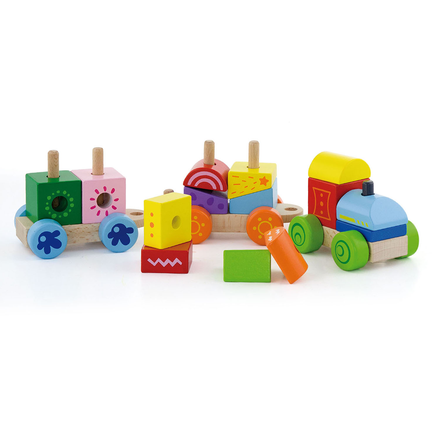 Sturdy, pegged cars are the base for 13 colourful pieces in assorted shapes and can be configured over and over again.