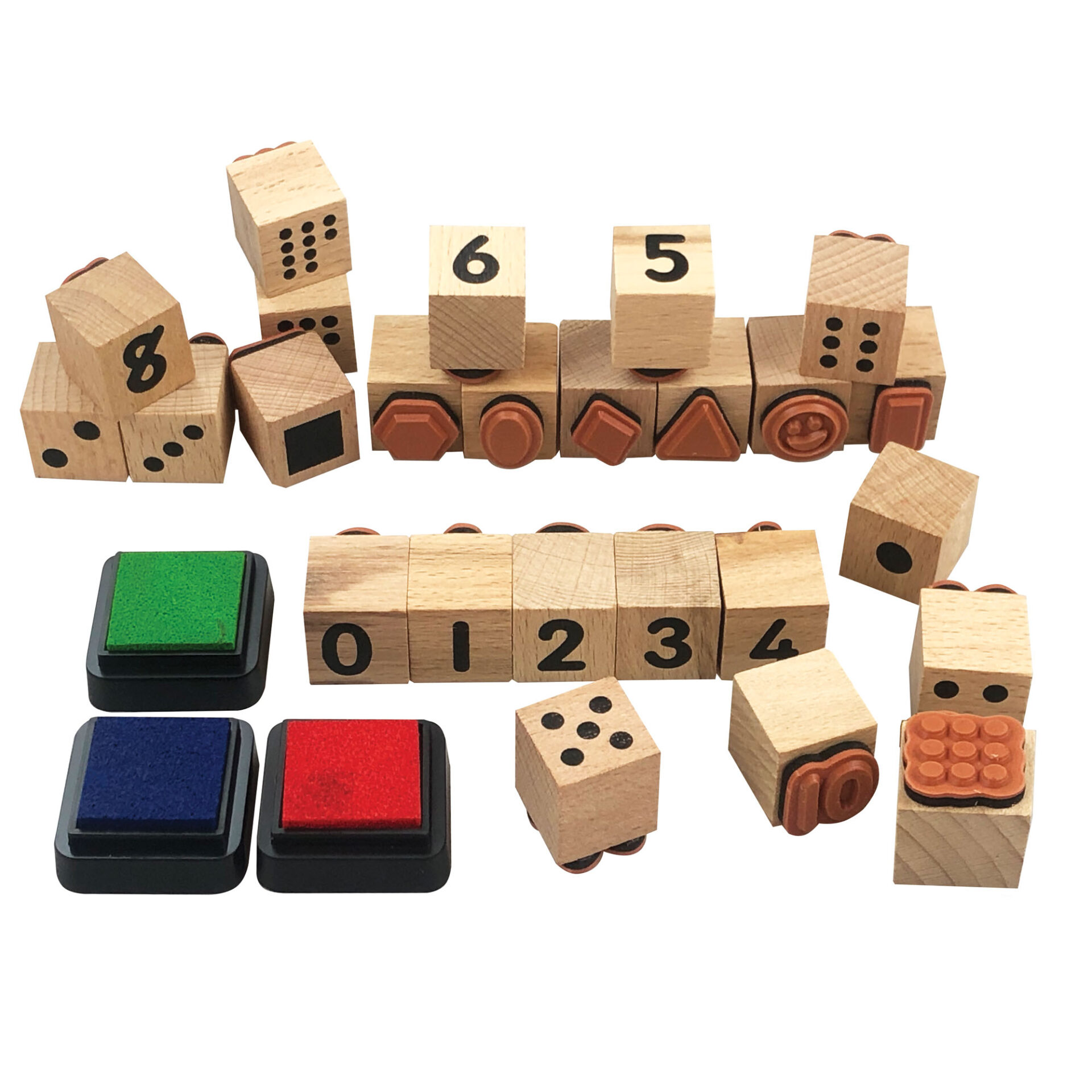 Our Number Stamp set contains 28 sturdy wooden-handled rubber stamps (numbers, dots and shapes), 3 colour ink pads and a 16-page activity book. The activity book encourages children to practice their numbers, learn quantities and values, counting, patterns, sums, sudoku puzzles and more.