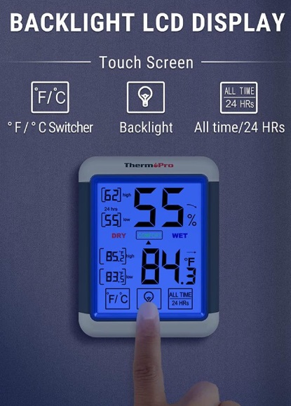 Equipped with professional-grade sensors, the TP55 thermometer provides accurate measurements, be it for indoor humidity or temperature, allowing you to be aware of adjustments that are necessary for your home. The indoor thermometer and humidity gauge are not just highly accurate but extremely user friendly with a backlight for that night-time last minute checks on current readings before bed. That’s not all, no longer will it be necessary to unmount the device from your wall or fridge to switch settings, simply use the touchscreen display. Furthermore, this temperature gauge provides an abundance of valuable information, such as displaying 24 hour/all-time high/low records and current trends for both humidity and temperature and humidity level icons that indicate if your home is too humid, too dry, or just right!