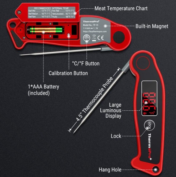 Start delivering properly cooked food to the table by using a food temperature thermometer. The ThermoPro TP19 waterproof electric meat thermometer is the ultimate choice for ultra-fast measurements to determine if your food is safe for consumption. Using its ultra-sensitive and fast Thermocouple sensor, this cooking thermometer with the probe can deliver the fastest readouts on the market in just 2-3 seconds.