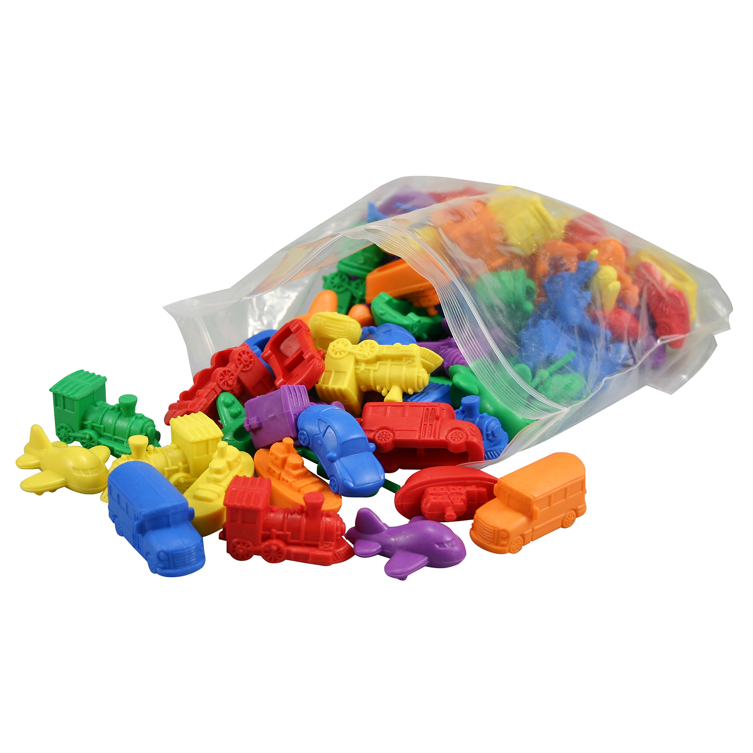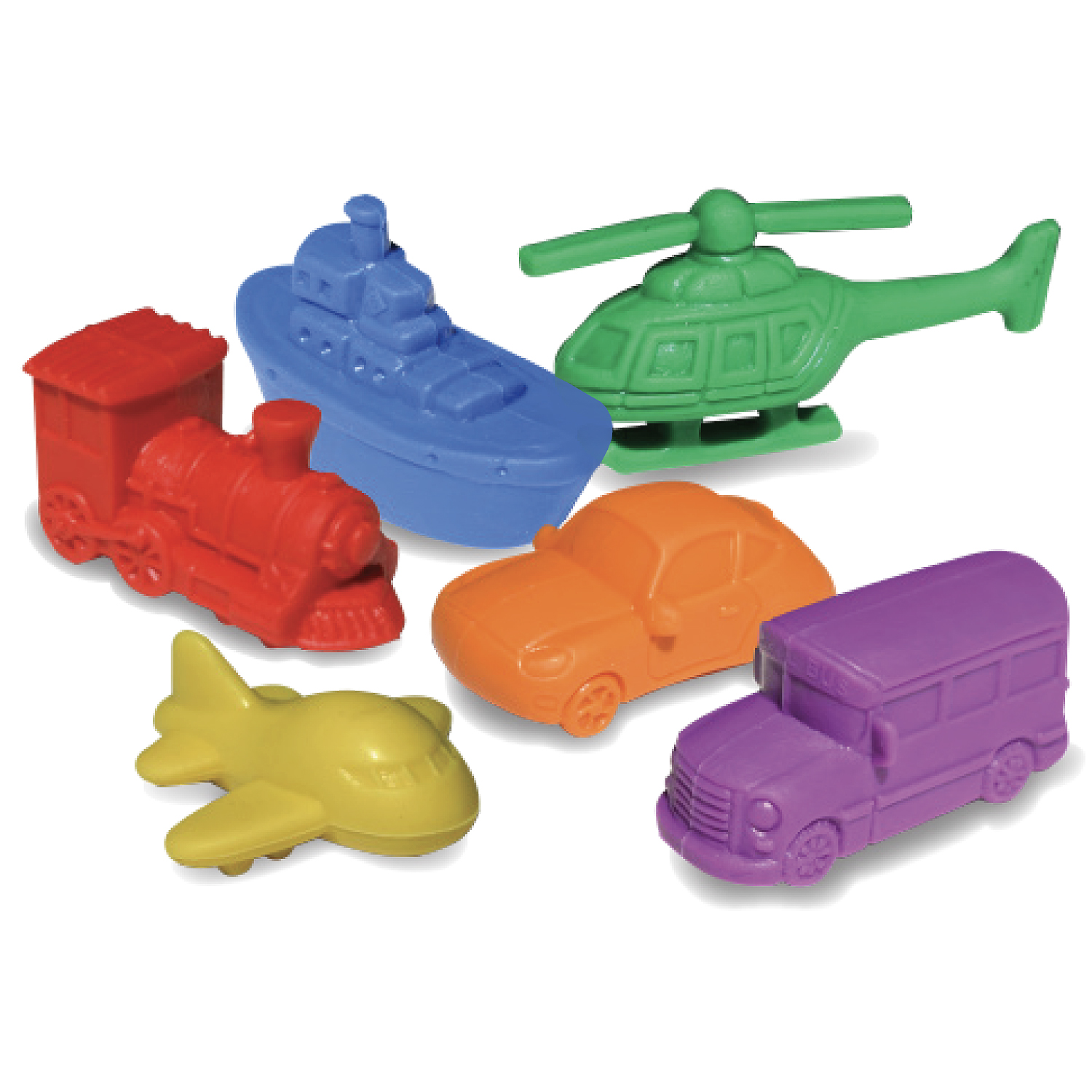 This set of 72 soft rubber counters comes in 6 colours (yellow, blue, red, orange, green, purple) and shapes (aeroplane, bus, car, helicopter, train and boat).