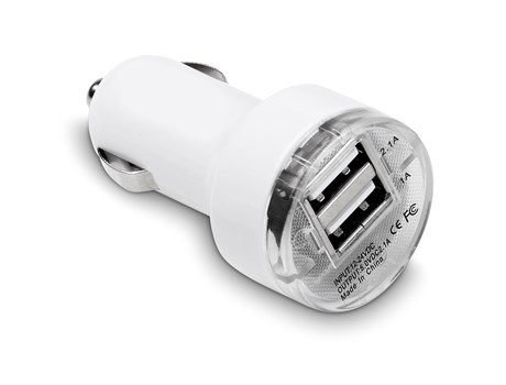 Always keep a charger handy with our dual USB Car Charger. Charges mobile phones & tablets. Input: 12-24V • output: 5V/2.1A/1A • FCC certification • ABS : 6.2 ( h ) x 3.2 ( dia )