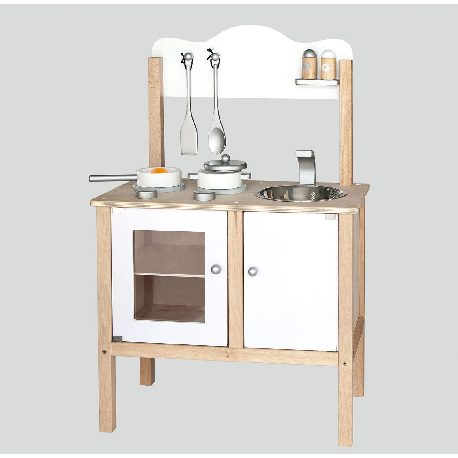 Assorted accessories include 1 spatula, 1 cooking spoon, 1 saucepan with lid, 1 frying pan with egg and 2 seasoning jars.