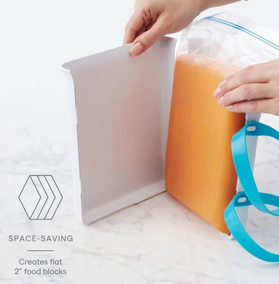 Freezing leftovers and meal prep has never been easier. With this Food Block Maker, you can transform soups, stews, and sauces into tidy bags of frozen food for an organized freezer. Simply insert a plastic storage bag into the container, fill and freeze in a standing position. The silicone bands are then removed, and the mold comes apart to reveal your perfectly frozen block of food. The food bags keep smells and colors from transferring to the mold, so no clean-up is necessary before your next freeze. The uniform blocks of food save precious freezer space and defrost faster and safer than larger cubes. With an organized freezer, your next meal is just a thaw away!