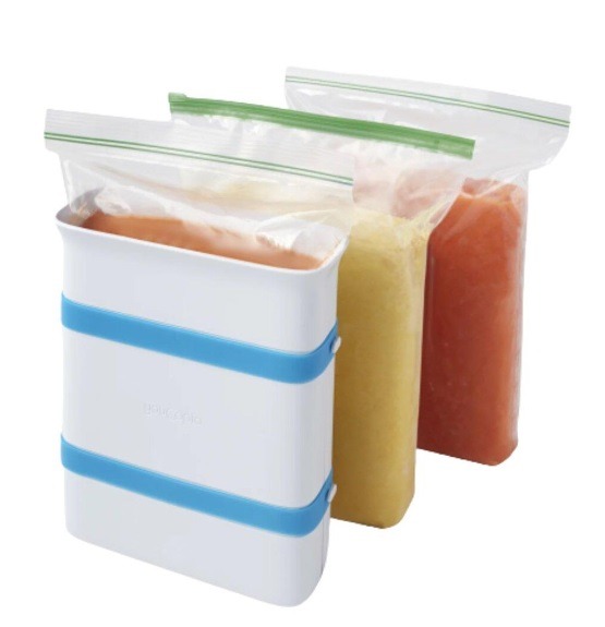 Designed to maximize freezer space, this food block maker forms soups, stews and sauces into frozen food cubes.