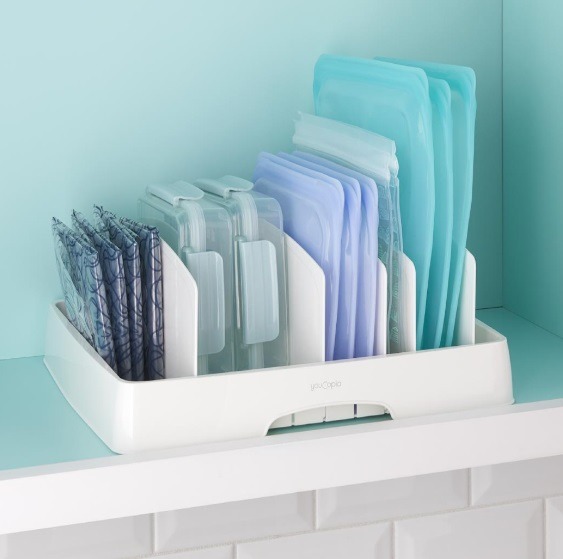 When it comes to food storage containers, it’s hard to stack or nest their lids conveniently. Keep similar lids together from small to large with this organizer which can be placed where it is most convenient for you, whether it’s a cabinet or countertop. It also includes five long adjustable dividers, one long and four small, to keep your lids together from small to large in a neat and orderly fashion. StoraLid is great for kitchen cabinet organization of reusable bags and wraps, napkins, paper and plastic plates, and children’s dinnerware. It fits in standard upper cabinets or deep drawers. With StoraLid Medium, you can organize container lids and pack leftovers in a snap.