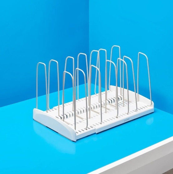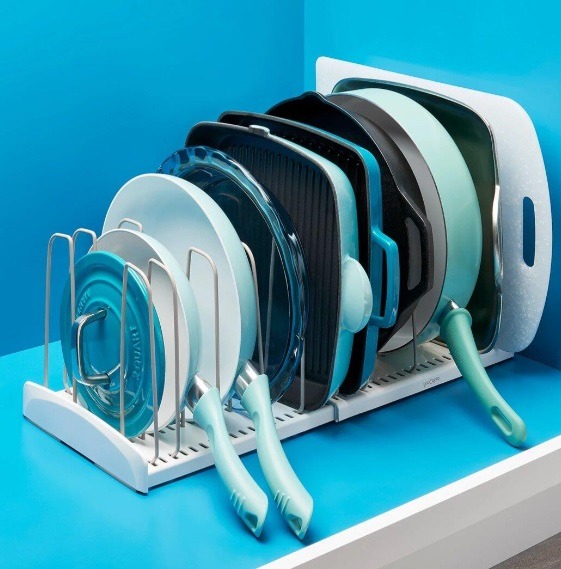 No longer will you have to worry about scratching or scuffing your cookware surfaces! This adjustable cookware rack for varied sizes, holds your pans and lids sideways to prevent stacking and further damaging to your cookware.