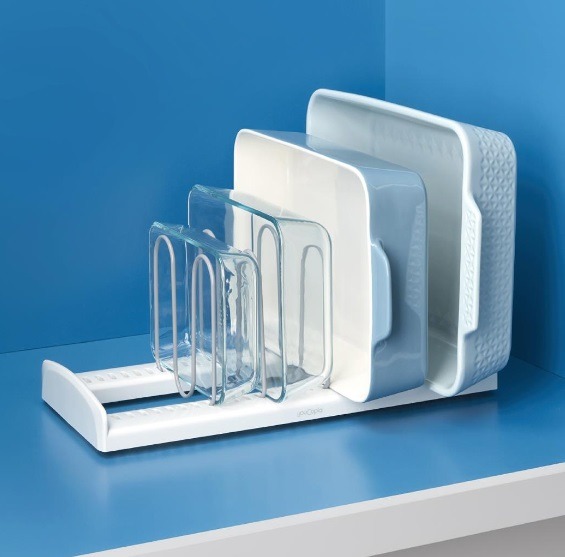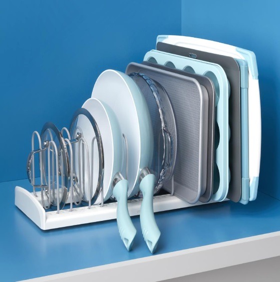 Sometimes, your cabinet may feel like a bottomless pit of various pans, baking sheets, and lids that don’t even match. To help you cope, this pan & lid rack will keep your pieces vertical & upright for utmost ease & visibility!