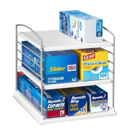 Keep it together while being able to find what you need. Holding up to 9kg, this space-savvy box organizer maximizes vertical space by storing foil, wrap and bag boxes horizontally in a dedicated (tidy) place. It fits most box sizes – even large family-sized ones – by simply adjusting the height of the shelves, and easily fits in the pantry or on cabinet shelves.