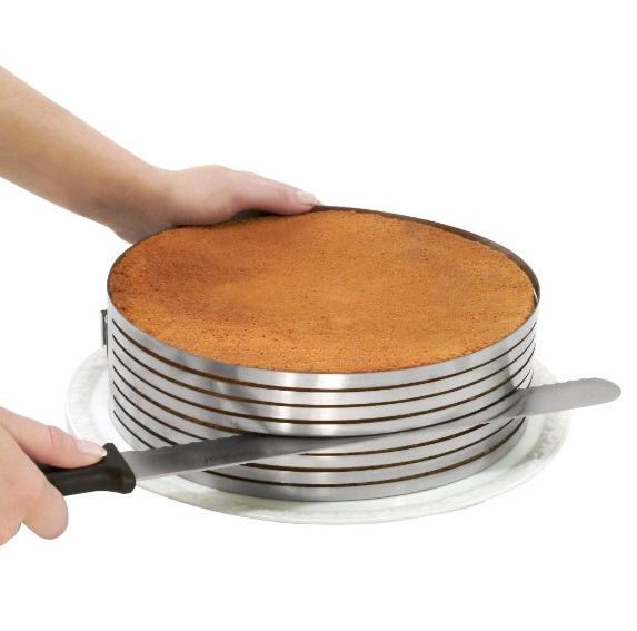Made from stainless steel with high-quality non-stick coating, this cake cutting aid is perfect for cutting cakes into layers. Place it around the cooled cake, chooses the thickness, and slice with a serrated bread knife, creating even layers ready for icing.
